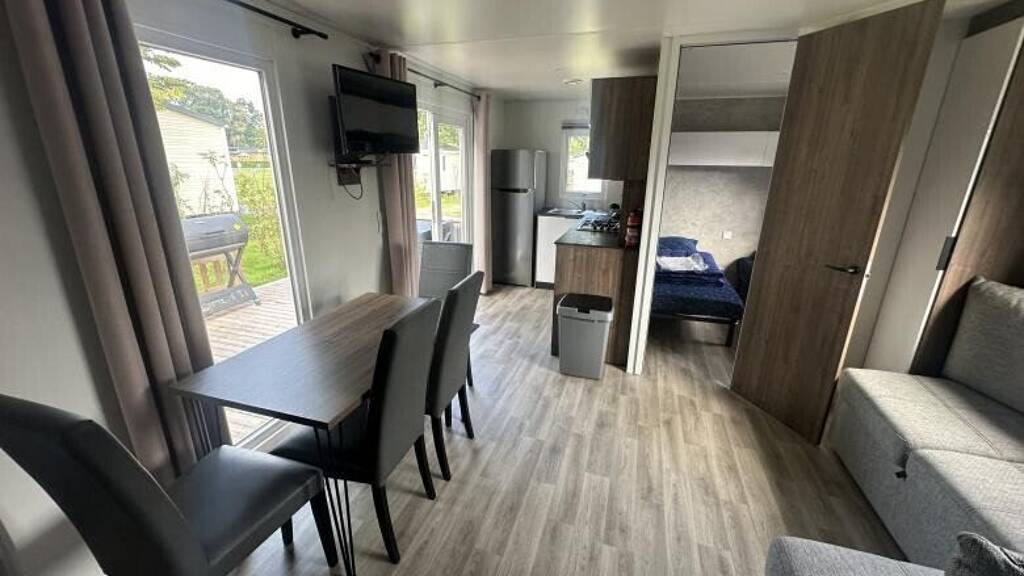 Ein kleines Wohnzimmer, das mit der Küche verbunden ist, mit zwei Terrassentüren zur Terrasse, ist geräumig