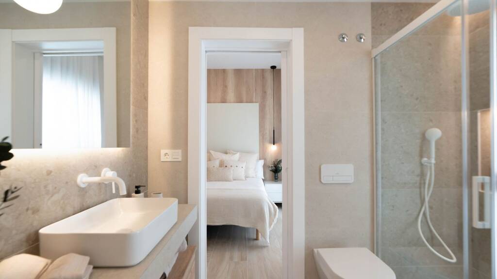 Im Obergeschoss finden Sie zwei großzügige Schlafzimmer, alle mit Einbauschränken und eigenem Bad. Das Hauptschlafzimmer öffnet sich zu einem gemütlichen privaten Balkon, auf dem Sie die Aussicht perfekt genießen können. Das Kronjuwel jeder Villa ist die weitläufige Dachterrasse, die viel Platz für einen Whirlpool, eine Außenküche und zum Entspannen in der Sonne bietet.