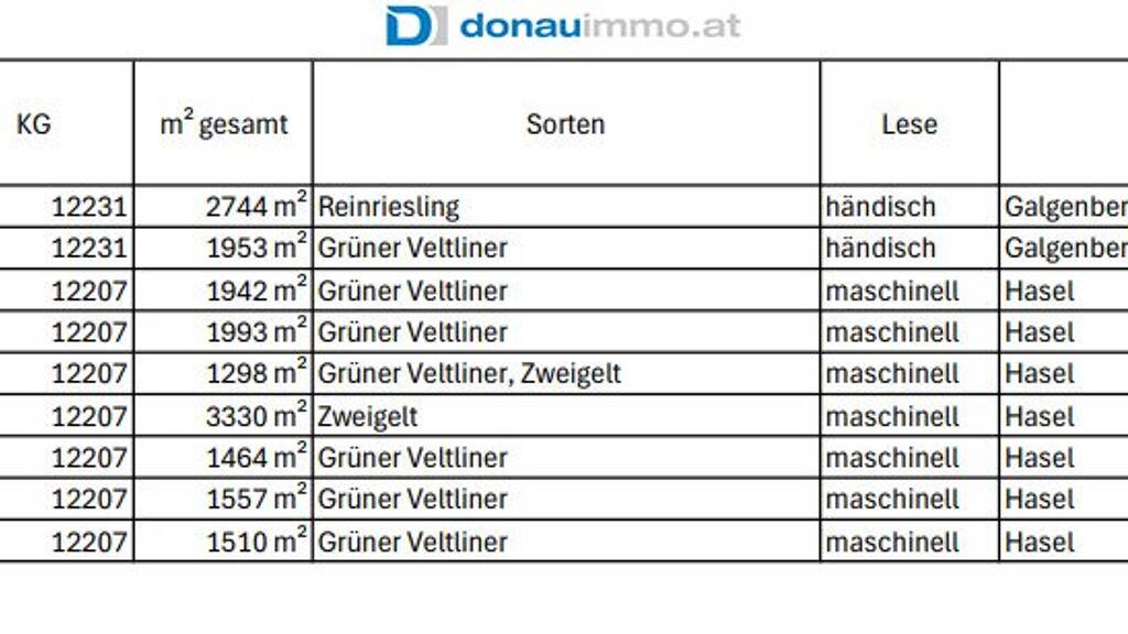 1,3 ha werden östlich von Straß in der Riede Hasel zum Verkauf angeboten, welche alle maschinell lesbar sind. Auf 0,8 ha werden davon Grüner Veltliner angebaut, sowie Zweigelt auf 0,3 ha. Zudem werden auf 0,1 ha Grüner Veltliner und Zweigelt gemischt angebaut.