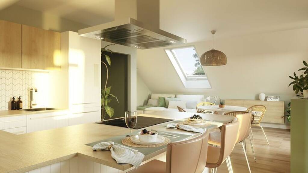 Das Mitwachshaus Flair 148 hat alles, was ein Haus zum Wohlfühlen benötigt: ein gemütliches Wohnzimmer mit hellem Essbereich und großen Fenstern, die viel Tageslicht hinein lassen. Die geräumige Küche bietet nicht nur Platz für das Familienfrühstück unter der Woche.