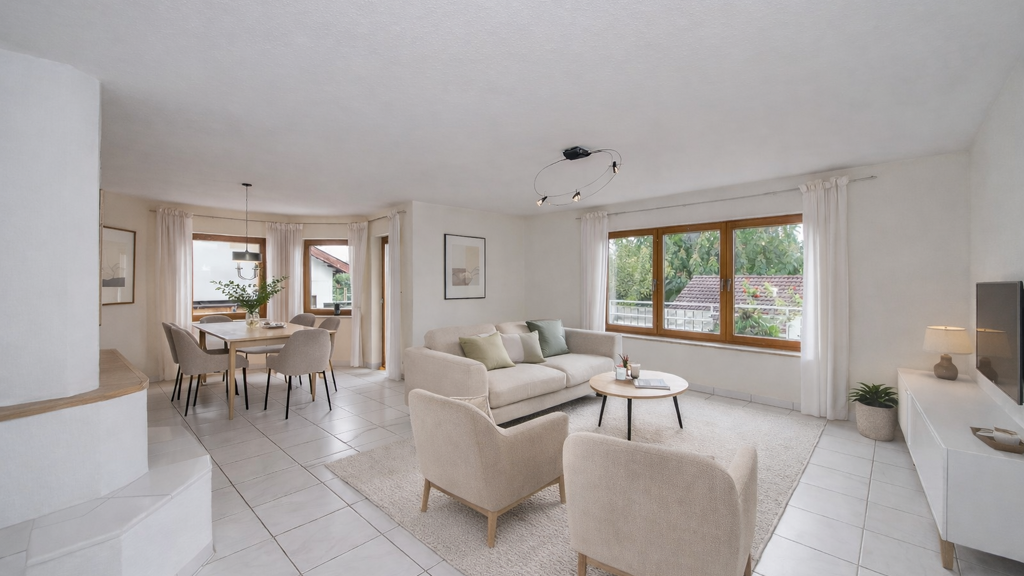 Das Herzstück bildet der lichtdurchflutete Wohn- und Essbereich mit großen Fensterflächen und herrlichem Blick ins Grüne. Die hochwertige Einbauküche mit Miele-Geräten sowie die liebevoll gestalteten Außenanlagen unterstreichen den besonderen Wohnkomfort.