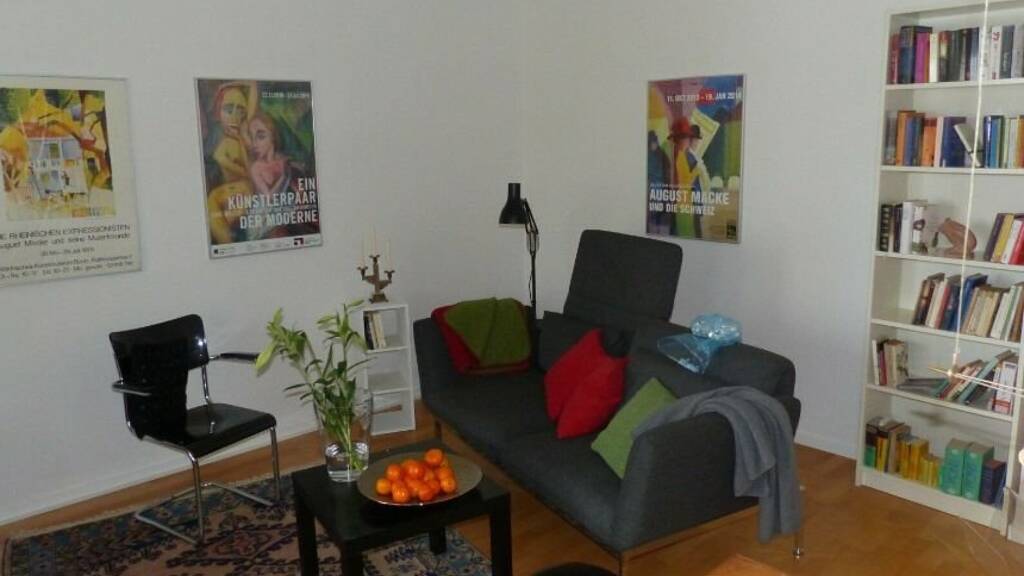 Fühlen Sie sich wohl in einer individuell eingerichteten 3-Zimmer-Wohnung im zweiten Obergeschoss eines solchen Hauses in Bonn-Duisdorf. Entspannen Sie abends auf dem Balkon (Westen) mit Blick in eine alte Eiche und auf die untergehende Sonne oder sitzen Sie im Herbst und Winter bei einem Glas Rotwein mit Kerzen auf einem gemütlichen Sofa im Wohn/Esszimmer oder im Arbeitszimmer.