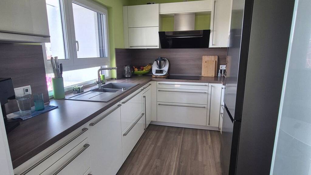 Wir vermieten unsere helle, moderne 3-Zimmer-Wohnung mit ca. 97m² Wohnfläche im 2. Obergeschoss eines in 2013 neu erbauten Mehrfamilienhaus (10 Einheiten) mit teilweise Blick über die Dächer der Nachbarn in Langenzenn. - Die Wohnung verfügt über einen großen Wohn-Ess-Bereich mit zwei Balkontüren zum schönen großen offenen Balkon inkl. elektr. Markise - Die Küche ist durch eine Glasschiebetüre zum Essbereich getrennt (hochwertige EBK mit nahmhaften Geräteherstellern). Eine separate Speisekammer bietet zusätzlichen Stauraum - einem Badezimmer (1x Badewanne + 1x bodengleiche Dusche inkl. Waschmaschinenanschluss, Fenster und Badmöbel) und einem separatem Gäste WC - eine gehobene Innenausstattung (hochwertiger Vinylboden, 3-fach verglaste Fenster, Insektenschutz, elektrische Rollläden, Fußbodenheizung, Einbauschrank). - ein eigenes Kellerabteil ist ebenfalls vorhanden. Im Gemeinschaftskeller sind ein Waschraum und Fahrradabstellraum nutzbar. - Die Wohnung ist durch einen Aufzug barrierefrei zugänglich (Wohnräume selbst barrierearm). - Zur Wohnung gehören zwei Stellplätze, einer ist freistehend direkt vor der Haustüre und einer ist überdacht. Diese müssen mitgemietet werden (im Mietpreis bereits enthalten). Die Wohnung ist ab dem 1.06.2026 verfügbar. Lage: Die Wohnung befindet sich angrenzend zum Neubaugebiet in Langenzenn, mit schneller Anbindung zur Schnellstraße. Nur wenige Gehminuten in grüner Idylle und Wald. In 10 Minuten in Fürth und 20 Minuten in Nürnberg. Die Wohnung wird mit Pelletsheizung geheizt und daher von Öl-/Gas Preisen nicht direkt betroffen. Nichtraucher erwünscht, Haustiere (ausgenommen Kleintiere) sind nicht erlaubt.