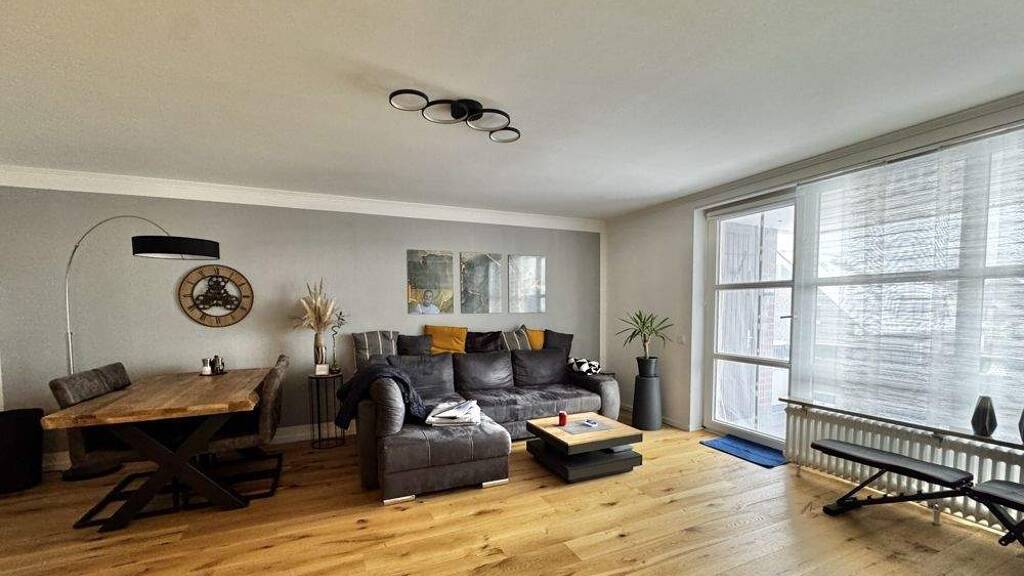 Über den ansprechend gestalteten Hauseingang gelangen Sie in die Wohnung, die mit modernem Laminatboden ausgestattet ist und ein zeitgemäßes Wohnambiente vermittelt. Der großzügige Wohnbereich bietet ausreichend Platz für einen kombinierten Wohn- und Essbereich und überzeugt durch seine helle Atmosphäre mit direktem Zugang zum westlich ausgerichteten Balkon. Ein praktischer Abstellraum ist direkt vom Balkon aus zugänglich und sorgt für zusätzlichen Stauraum.
