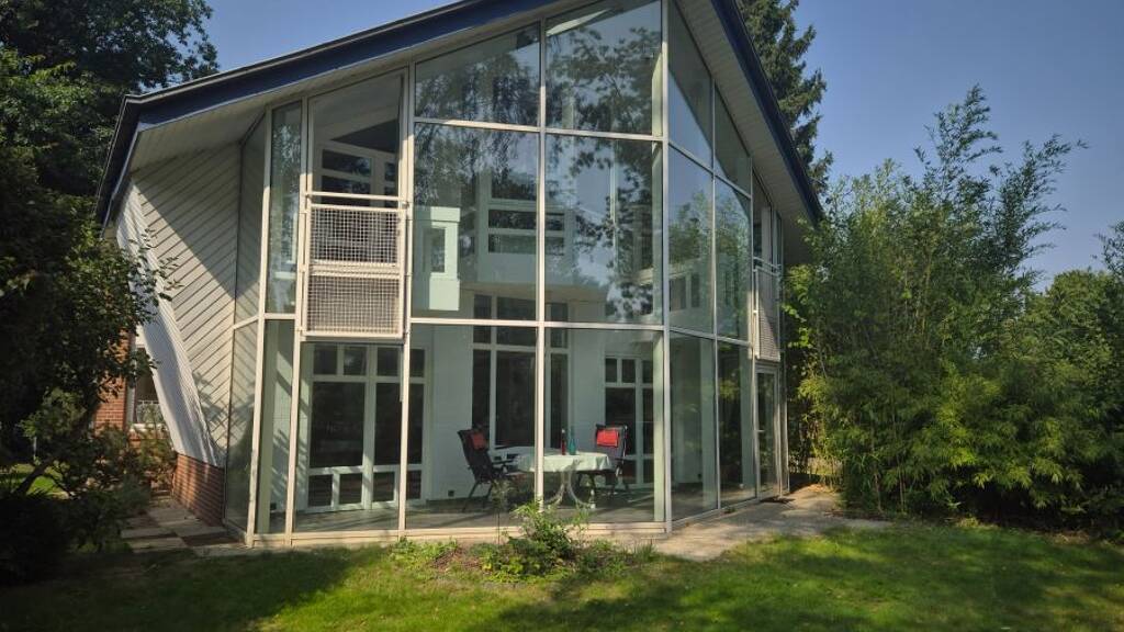 Das passive Solarhaus besticht durch sein außergewöhnliches Design. Das Highlight des Hauses ist der 18 Quadratmeter große Sonnenhof mit seiner bis zu 7,50 m hohen Glasfassade. 2 Balkone und ein Erker reichen in den Sonnenhof hinein.