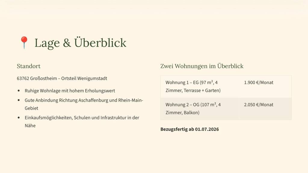 Zur Vermietung steht eine luxuriöse Neubau-Erdgeschosswohnung im Ortsteil Wenigumstadt (63762 Großostheim). Die Wohnung ist bezugsfertig ab 01.07.2026 und überzeugt durch hochwertige Ausstattung, moderne Haustechnik sowie einen schönen Außenbereich.