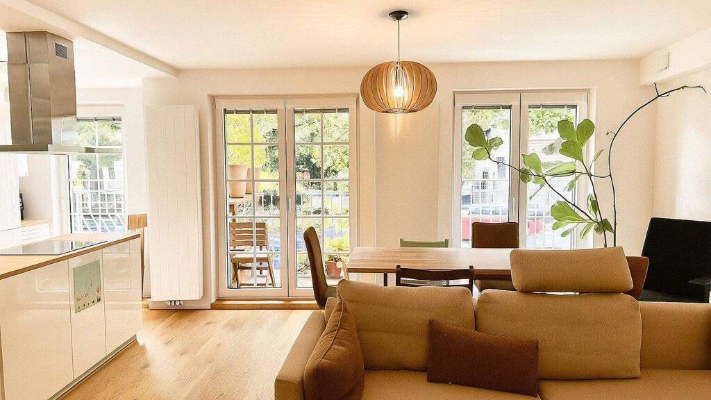 Das großzügige Wohnzimmer öffnet sich über zwei französische Balkontüren zur Herbeckstraße und beeindruckt durch seinen hellen, offenen Charakter. Die ursprünglich abgetrennte Küche wurde modern und hochwertig in den Wohnraum integriert und zu einer eleganten, voll ausgestatteten Wohnküche umgestaltet - ein echter Mittelpunkt für gemeinsames Leben und Genießen.