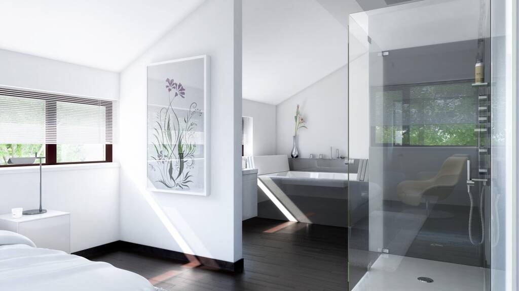 Im Innern werden Bewohner und Besucher von einer geräumigen Diele mit Garderobenbereich empfangen, die viel Bewegungsfreiheit zum An- und Ausziehen von Schuhen und Jacken bietet. Wer schnell die Hände waschen möchte, kann das im Gästebad tun, das direkt neben dem Eingang liegt. Offen schließt sich der Wohn-, Ess- und Kochbereich an die Diele an. Der großzügige Raum lässt viele Gestaltungsmöglichkeiten zu. Der Bereich vor der Fensterfront bietet sich beispielsweise für einen großen Esstisch an. Auf der linken Seite findet eine lange Küchenzeile Platz, die um eine praktische Kochinsel mit Theke ergänzt werden kann. Letztere bildet nicht nur den ersten Anlaufpunkt für Gäste, sondern erweist sich auch als schöner Treffpunkt für den Kaffee zwischendurch. An die Küche schließt sich eine kleine Speisekammer an, in der die Vorräte griffbereit verstaut werden können. Größere Geräte und Gegenstände lassen sich im Hauswirtschaftsraum unterbringen. Die rechte Seite des Raumensembles ist für die Couchlandschaft reserviert. Unter dem Dach finden sich zwei annähernd gleich große Kinderzimmer, ein Elternschlafzimmer mit integriertem Ankleidebereich sowie einem gemütlichen Familienbad.