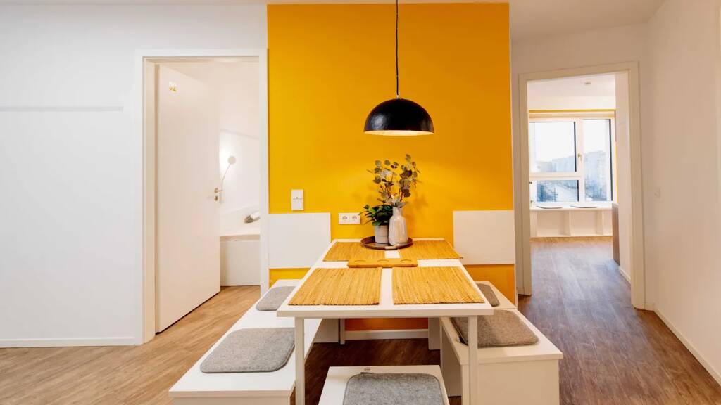 Dieses Zimmer in der 3er WG hat eine Gemeinschaftsküche mit einem großem Esstisch. Dein Zimmer ist Abschließbar.