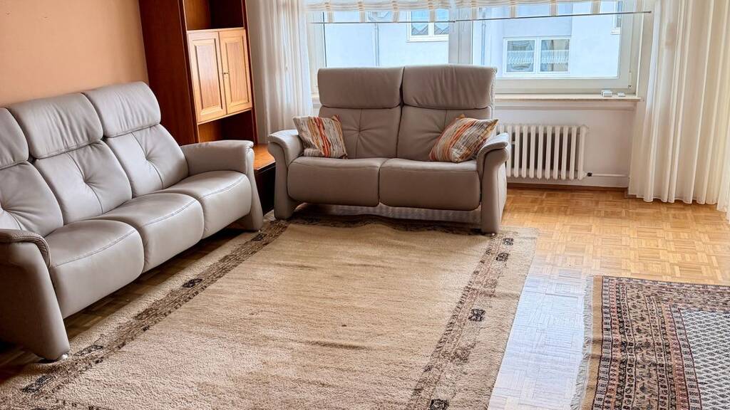 Optional können hochwertige Möbel übernommen werden, darunter ein maßgefertigter Wohnzimmerschrank aus Kirschholz sowie ein Himolla Ledersofa (3-Sitzer und 2-Sitzer) mit Liegefunktion.