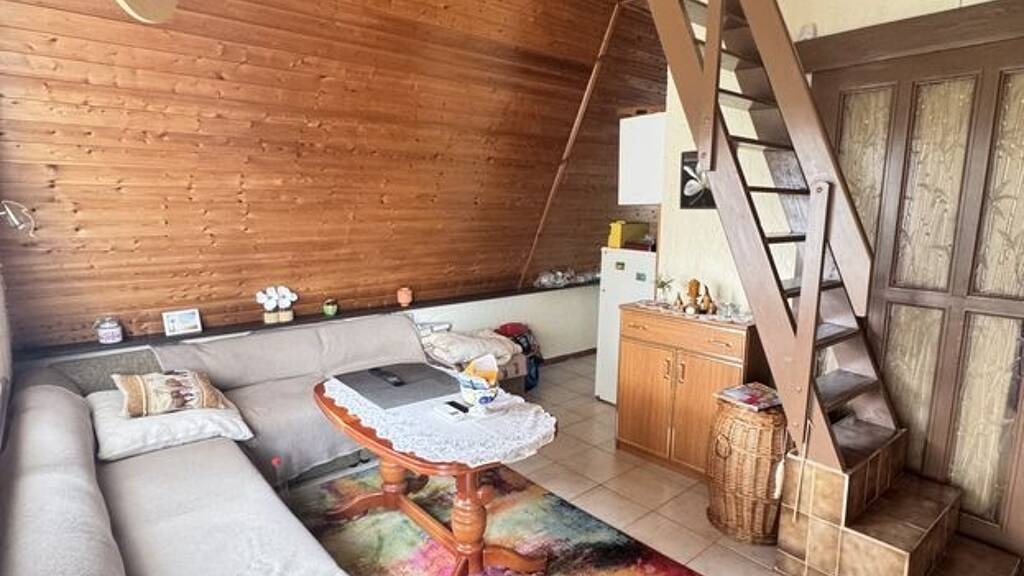 Sie bietet auf ca. 34 m² Innenfläche 2 kleine Schlafzimmer unter dem Dach, ein geräumiges Wohnzimmer im Erdgeschoss sowie ein Duschbad und einen Küchenbereich inkl. Einbauküche.
