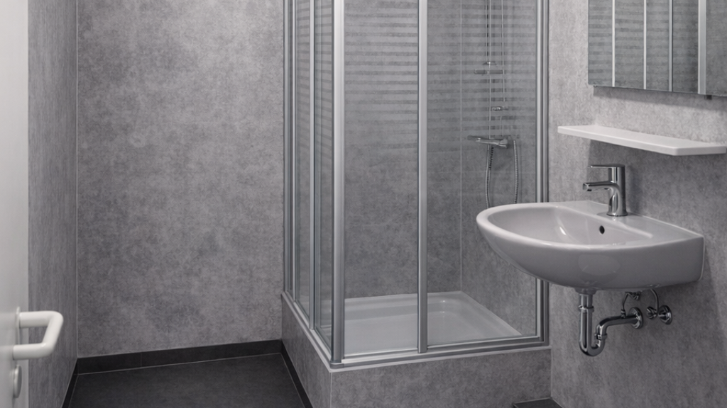 Auch das Badezimmer wird frisch saniert mit neuen Wänden, Böden und neuen Armaturen in einem modernen Design.