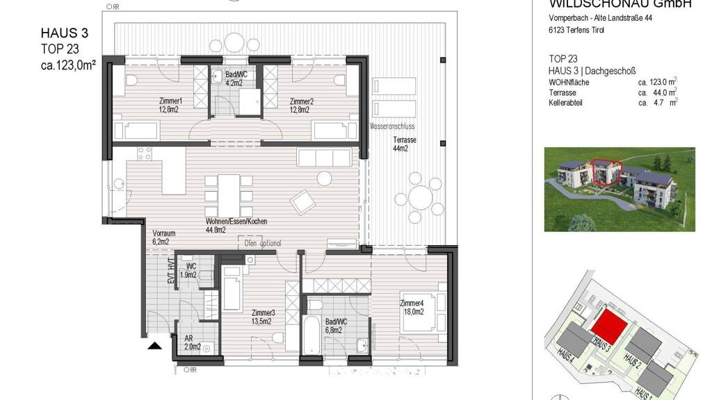 Anzahl Terrassen: 1, Balkon-Terrassen-Fläche: 44,00 m², Kellerfläche: 4,70 m², Bundesland: Tirol, 4 Etagen, Wohnungsnr.: Top 23