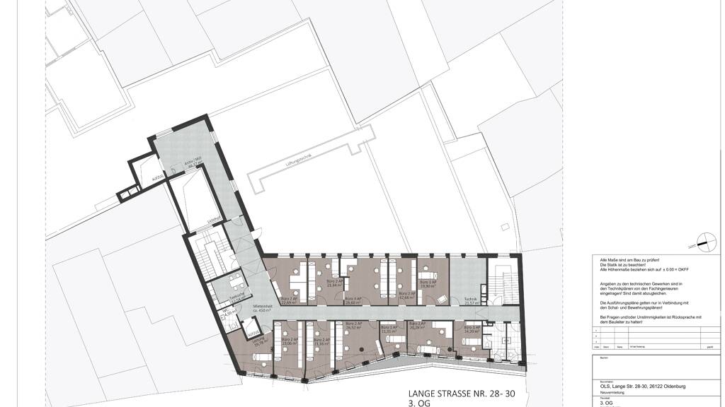 Für die Flächen im 1. Obergeschoss wurden jeweils Flächengewichte für TGA von ca. 30 kg/m² und für abgehängte Deckenkonstruktionen von ca. 20kg/m² angesetzt. Höhere Lasten sind im Einzelfall abzustimmen. Mit Vertragsunterzeichnung verpflichtet sich der Mieter zur Einhaltung der o.g. statischen Vorgaben.