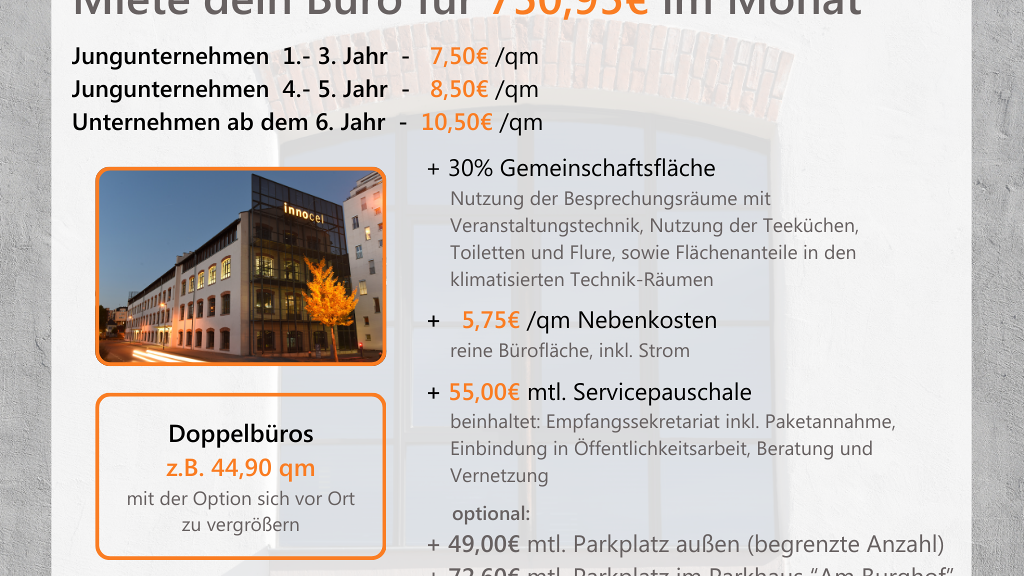 Bürogebäude für B2B, ür Start-ups(1. bis 3. Jahr nach Gründung) und Jungunternehmen (4. und 5. Jahr nach Gründung) gelten günstigere Nettomieten