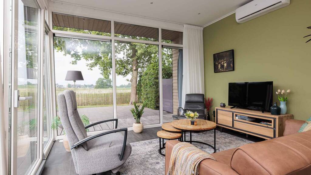 Wohnzimmer Wenn Sie das Haus betreten, erleben Sie sofort das echte Urlaubsgefühl. Die Kombination aus hohen Decken, reichlich Tageslicht und stilvoller Einrichtung macht die Module 31 besonders gemütlich. Die grüne Wand passt nahtlos zum freien Blick und lässt den Raum endlos wirken. Das eingerichtete Wohnzimmer verfügt über eine Schiebetür zum Garten. Auf diese Weise können Sie im Sommer ein herrliches Innen- und Außenwohnerlebnis schaffen!