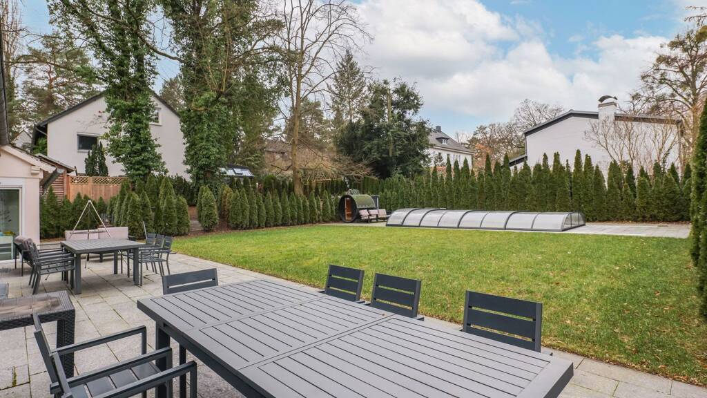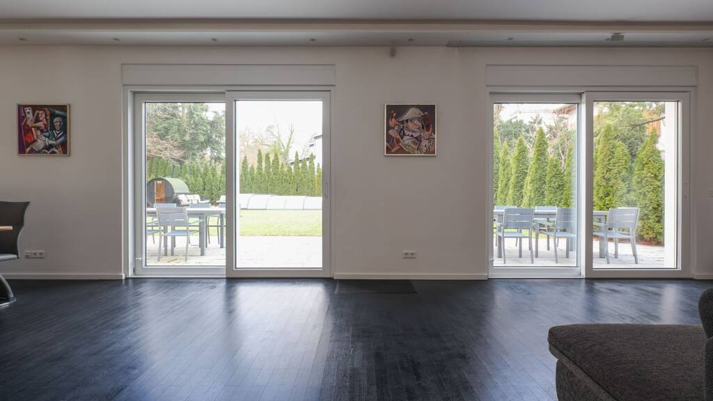 Wenn Sie nicht gerade Filme auf der Leinwand genießen, geben die großen Fensterflächen im Wohnbereich einen traumhaften Blick in den liebevoll gepflegten Privatgarten frei. Ein besonderes Juwel ist der große beheizte Außenpool, der zum Entspannen und Genießen einlädt. Der Garten wird ergänzt durch eine weitläufige Terrasse mit großer elektrischer Marquise, die perfekt für gesellige Stunden im Freien oder einfach zum Verweilen in ruhiger Atmosphäre ist.