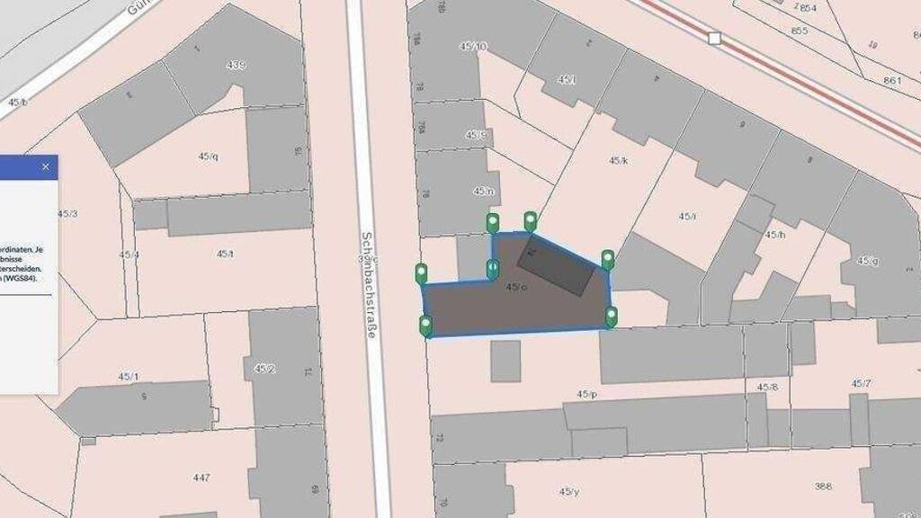 Das Grundstück weist eine Straßenfront von etwa 16,80 m und eine Tiefe von ungefähr 25 m auf. Eine etwa 1,80 m hohe Ziegelsteinmauer bildet die Begrenzung des Flurstücks. Die Zufahrt erfolgt über ein Stahltor. Im hinteren Teil des Grundstücks sind Überreste eines früheren Lagergebäudes zu finden, darunter ein Zwischenbau aus Metallblech und ein überdachter Bereich.