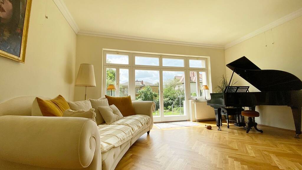Inmitten eines gepflegten, begrünten Anwesens erhebt sich die prachtvolle Villa Friedensreich, ein architektonisches Juwel aus dem Jahr 1895, das ab 2007/2008 mit viel Liebe zum Detail und großem Respekt vor der historischen Bausubstanz umfassend denkmalgerecht saniert wurde. Der Name der Villa Friedensreich steht sinnbildlich für die harmonische Verbindung von Geschichte, Ästhetik und Lebensqualität. Bereits beim Betreten der Villa empfängt Sie ein einladender Treppenflur, der mit restaurierten Verzierungen und original erhaltenen Malereien den Charakter vergangener Epochen lebendig werden lässt. Die historischen Stuckelemente, hochwertiges Parkett in Wohn- und Schlafräumen sowie Marmorfliesen in den Bädern unterstreichen den außergewöhnlichen Anspruch an Stil und Qualität. Das Herzstück der Villa bilden sowohl im Erd- wie auch im Obergeschoss jeweils das großzügige Ess- oder Gesellschaftszimmer, das durch einen fließenden Übergang in das stilvolle Wohnzimmer übergeht - mit einem herrlichen Blick auf das malerische Anwesen. Die Verbindung von Erd- und Obergeschoss erfolgt über eine elegante Treppe. In beiden Wohnebenen erwarten Sie ein atmosphärisches Herrenzimmer, stillvolle Arbeitszimmer, geräumige Schlafzimmer sowie hochwertig ausgestattete Bäder und komfortable Küchen, die keine Wünsche offenlassen. Im Dachgeschoss befindet sich eine separate, aktuell vermietete Wohnung mit Dachterrasse und einem traumhaften Blick über das Elbtal - ein Rückzugsort mit ganz besonderem Charme. Historische Holzfenster sorgen in allen Räumen für Authentizität und Lichtfülle. Ein großer Kellerbereich mit geräumigen Abstellflächen und Sauna sowie zwei Garagen bieten höchsten Komfort. Das gepflegte Anwesen wird durch einen romantischen französischen Pavillon im Gartenbereich vollendet - ein Ort der Ruhe und Inspiration. Die Villa Friedensreich ist mehr als ein Zuhause - sie ist ein Ausdruck von Kultur, Geschichte und Lebensstil. Ein einzigartiges Denkmal, das Tradition und moderne Wohnqualität auf beeindruckende Weise vereint.