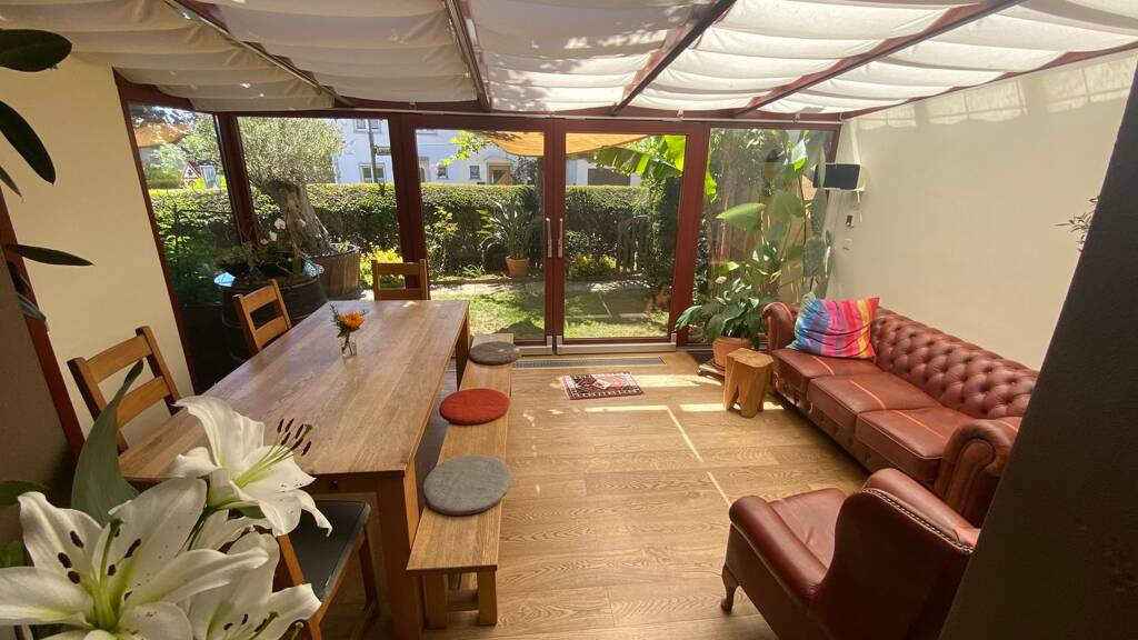 Der sonnige Garten ist nach Süd/Südwest ausgerichtet und lädt mit einer 19,3 m² großen Terrasse inklusive Kaltwintergarten zum Verweilen ein.