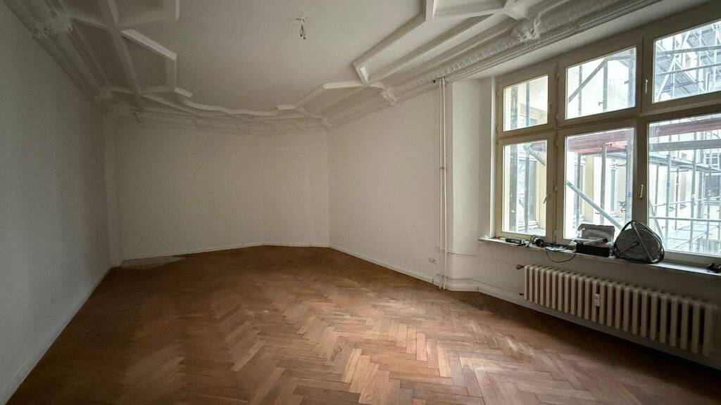 Herzstück der Wohnung ist das außergewöhnlich große Wohn- und Empfangszimmer mit beeindruckender, aufwendig erhaltener Stuckdecke, die dem Raum eine repräsentative und zugleich stilvolle Atmosphäre verleiht. Die Raumhöhe und die historischen Details unterstreichen den typischen Altbaucharme.