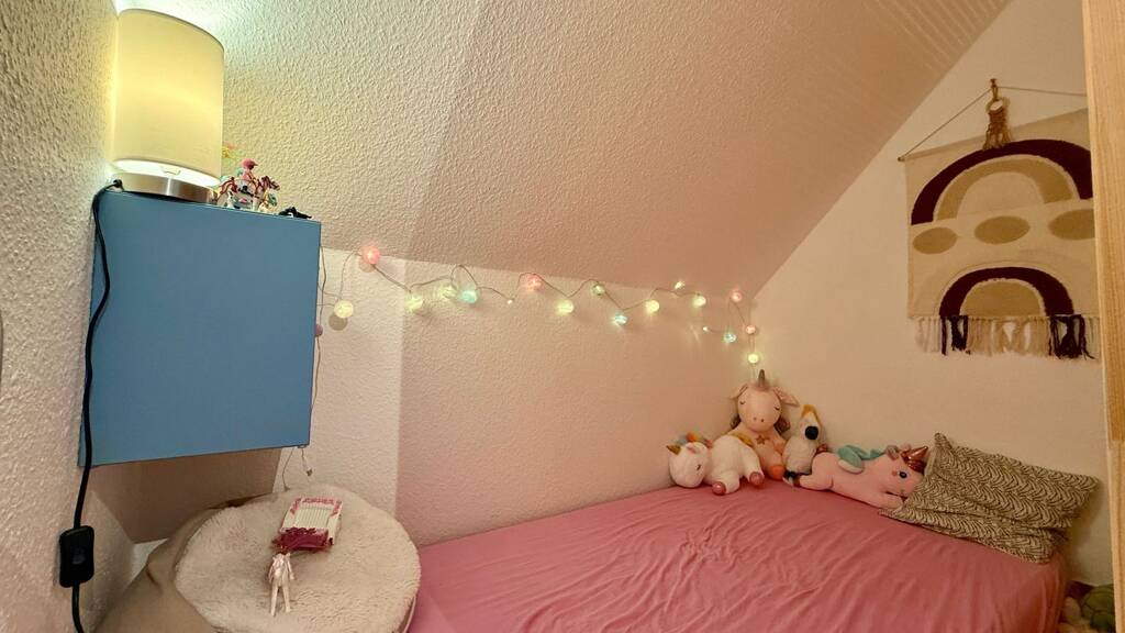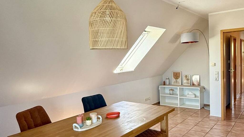 Die Einbauküche mit Hochbaubackofen und Ceranfeld ist, wie alle Räume in der Wohnung, mit schönen Terrakottafliesen ausgestattet. Eine Fußbodenheizung sorgt für ein angenehmes Raumklima. Ein Gäste-WC ist ebenfalls vorhanden. Das gegenüberliegende Badezimmer hat eine angenehme Größe. Es ist sowohl mit einer Badewanne, als auch mit einer Dusche ausgestattet. Auch die Waschmaschine findet hier ihren Platz. Das Schlafzimmer ist nach Osten ausgerichtet. Staubsauger und Bügelbrett können Sie in einem zweiten Abstellraum unterbringen Noch mehr Abstellfläche finden Sie auf dem zu der Wohnung gehörenden Spitzboden. Auch ein Kellerraum darf ist mir dabei. Insgesamt eine durchdachte Wohnung in einem jungen Haus ohne Renovierungsstau. Überzeugen Sie sich selbst. Zu der Wohnung gehört ein Stellplatz für ein KFZ.