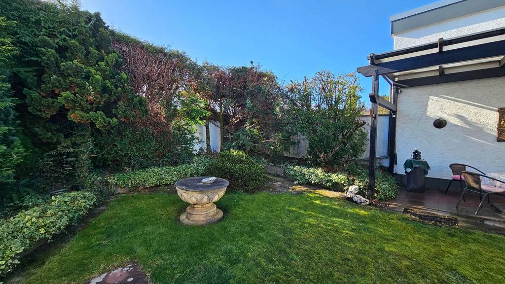 Aus dem Wohnzimmer blickt und gelangt man in den atriumartigen, nicht einsehbaren Garten mit großer überdachter Terrasse. Im hinteren Bereich, erreichbar auch durch ein Gartentor, befindet sich ein überdachter Stellplatz für Mülltonnen, Fahrräder o. Ä.