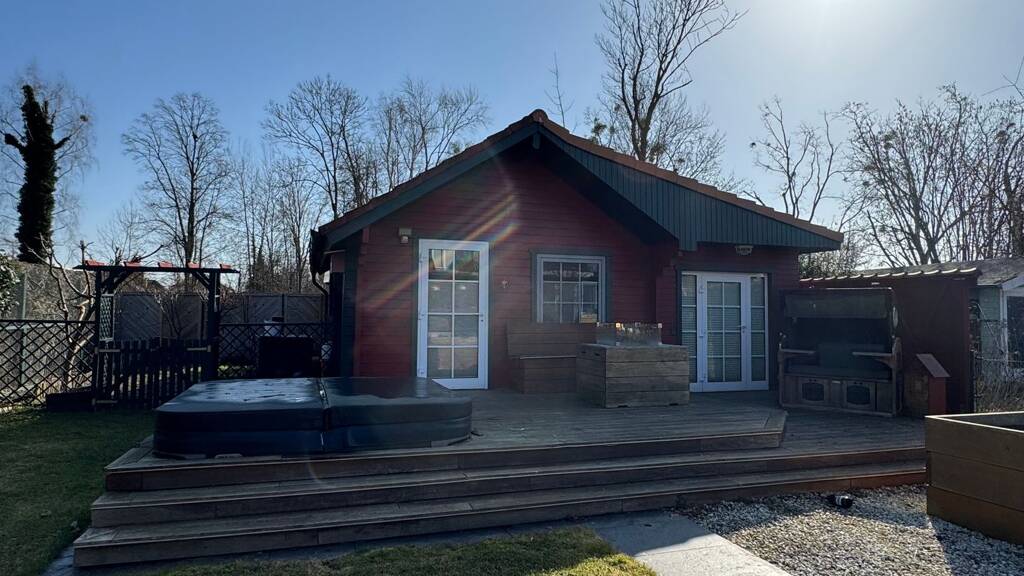 Außerdem befindet sich im hinteren Teil des Grundstücks ein massiver Bungalow im Blockhaus-Stil, der wiederum knapp 40 qm Fläche ausweist.