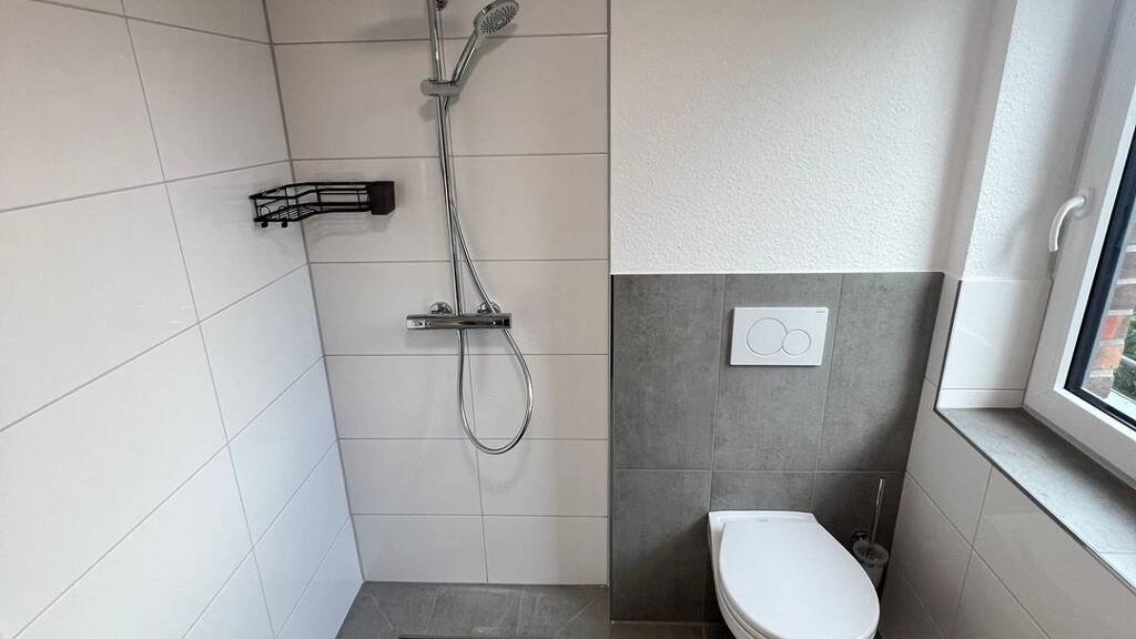 Die Badezimmer sind modern in Weiß-/Grautönen gefliest und verfügen über eine begehbare Dusche sowie einen großen Handtuchheizkörper.