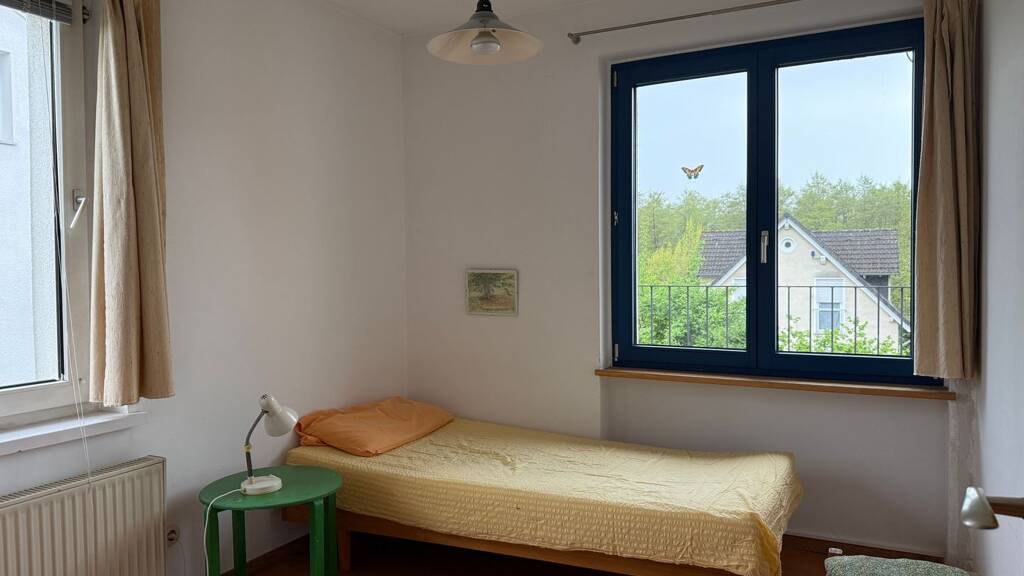 In der oberen Etage finden sich ein Schlafzimmer, mit direktem Zugang zum Balkon, der sich über die gesamte Hausbreite erstreckt. Zusätzlich gibt es ein Tageslicht-Wannenbad, ein Kinder- und ein Gästezimmer.