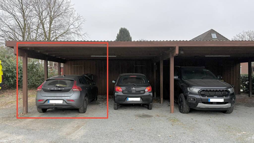 Zur Einheit gehört ein Carport-Stellplatz mit angrenzendem Schuppen, der zusätzlichen Stauraum für Fahrräder, Werkzeug oder Haushaltsgegenstände bietet.