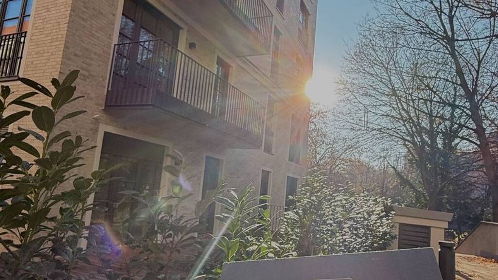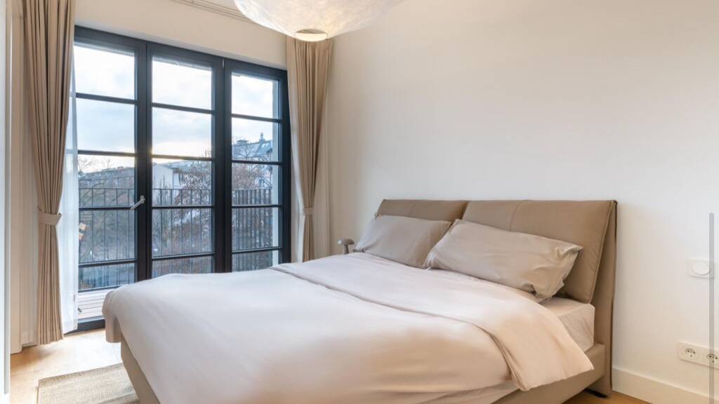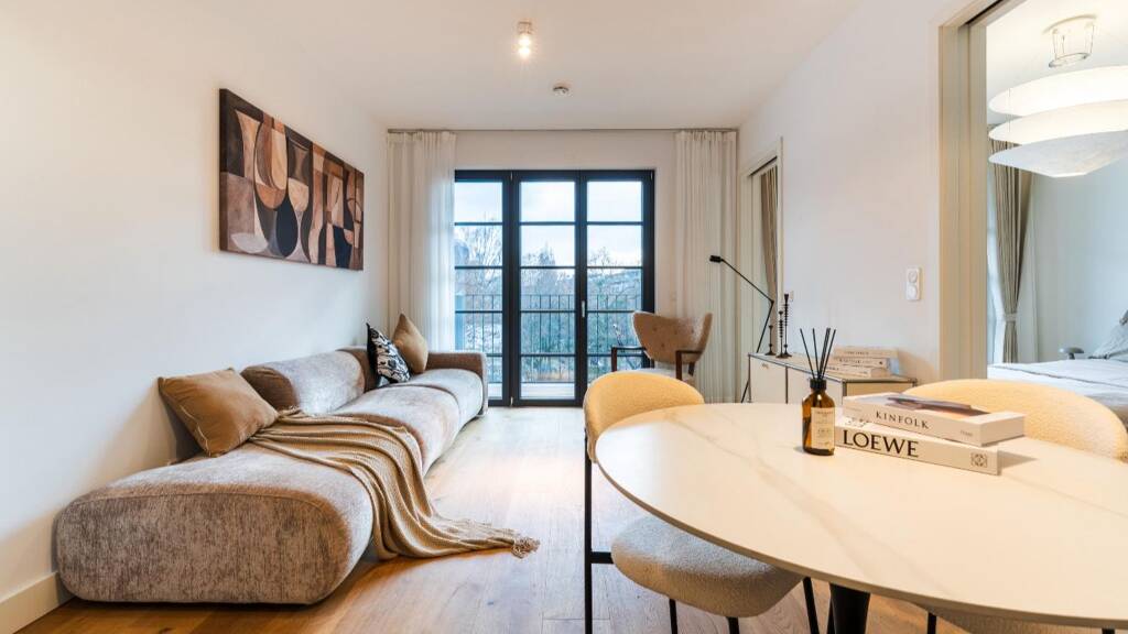 Elegantes 2 Zimmer Apartment mit gutem Ausblick Küche Möbeln und einem Badezimmer Eine grüne Oase in urbaner Lage Der Neubau liegt in einem großzügigen typischen Altberliner Innenhof — durch das Vorderhaus geschützt vor Straßenlärm und Hektik. Die helle Klinkerfassade mit den großen Balkonen macht das Haus zu einem optischen Highlight. Einen faszinierenden Kontrast bilden bodentiefe dunkelgraue Sprossenfenster. Sie sorgen für viel Licht im Innenraum und einen Hauch industriellen Charmes nach außen — in Anlehnung an den originalen, ursprünglich gewerblich genutzten Hof in Südlage. Überhaupt erhält der Hof durch seine offene Gestaltung und den Weitblick einen geradezu idyllischen Charakter — ein Ort, den man mitten in der Innenstadt gar nicht vermuten würde. Die Anlage bietet Wohnraum auf 6 Etagen plus ein geschützt liegendes Gartengeschoss. Die hauseigene großzügige Tiefgarage ist über eine Rampe erreichbar. Selbstverständlich wird SIGNUM auch hier seinem Anspruch gerecht, es gibt eine Infrastruktur für Ladesäulen, an denen zukunftssichere Elektroautos geparkt und geladen werden können.