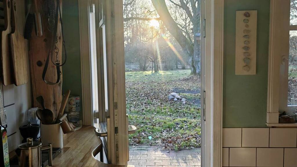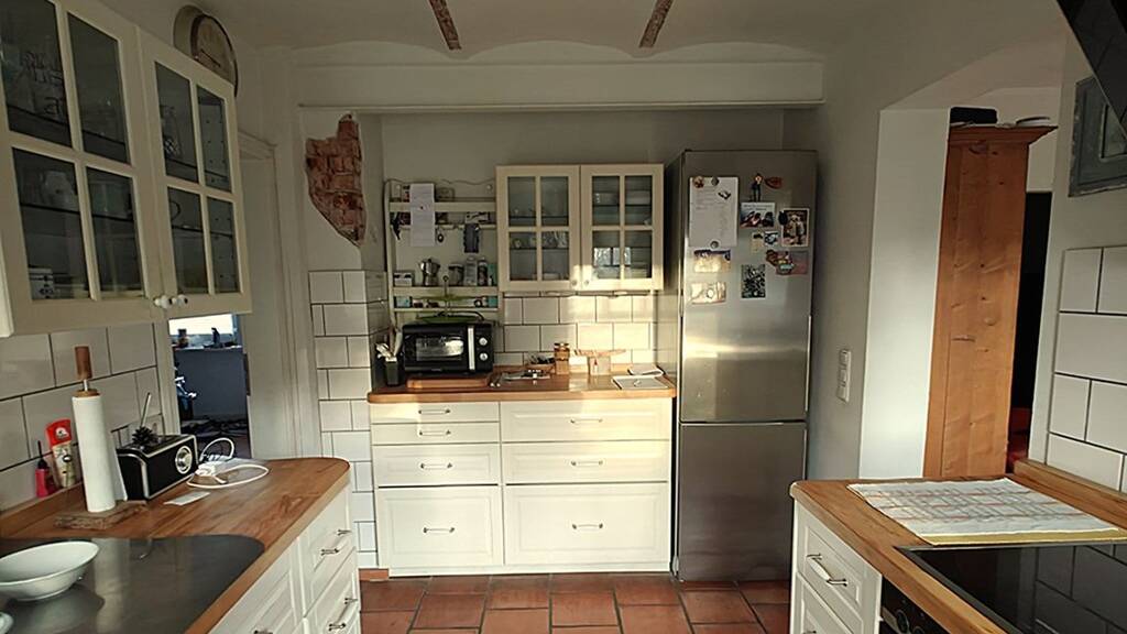 Große Fensterflächen sorgen für viel Tageslicht und verleihen den Räumen eine offene und freundliche Ausstrahlung. Warme Holzböden, Terrakotta-Fliesen, helle Wandflächen und charaktervolle Details schaffen eine wohnliche Atmosphäre mit individuellem Charme.