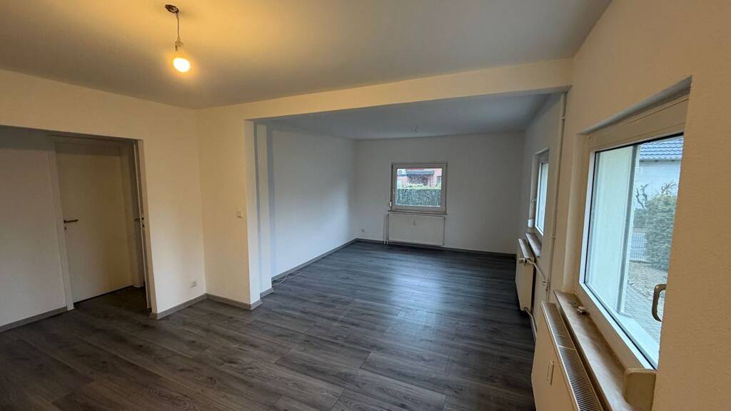 Das große, lichtdurchflutete Wohnzimmer bietet viel Platz für Wohnen und Essen und schafft eine angenehme, offene Wohnatmosphäre.