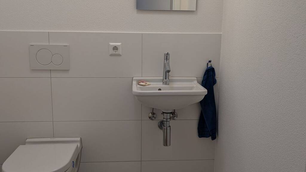 Durch die KfW-40-Bauweise in Verbindung mit einer Viessmann-Wärmepumpe und wassergeführter Fußbodenheizung erfüllt das Gebäude höchste energetische Standards. Der Bodenbelag in den Zimmern ist ein angenehmes Holzbodenoptik-Vinyl in des Herstellers Parador. Bad und WC sind cremeweiß gefliest mit blauen Fliesen im Duschbereich.