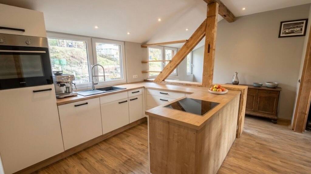 Großzügige und energetisch vollsanierte 4-Zimmer-Wohnung mit ca. 150 m² Wohnfläche. Der Zugang zur Wohnebene erfolgt über ein separates Treppenhaus, was der Immobilie einen ungestörten Haus-in-Haus-Charakter verleiht. Die Wohnräume zeichnen sich durch freigelegte Holzbalken, einen durchgängigen Bodenbelag in Holzoptik und eine hervorragende natürliche Belichtung durch beidseitige Fensterfronten und Dachgauben aus.
