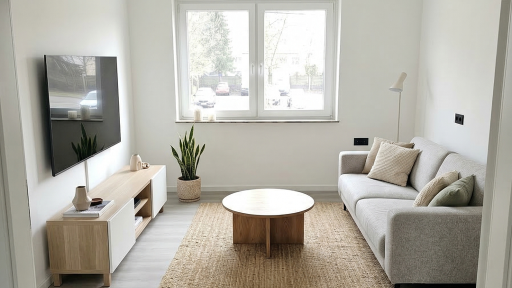 Der Grundriss ist praktisch und gut nutzbar: Die Wohnung verfügt über ein Wohnzimmer, ein Schlafzimmer, eine große Wohnküche, einen Flur sowie ein modernes Bad mit Dusche und Spiegelschrank. Die Räume wirken hell, offen und lassen sich vielseitig und individuell einrichten.