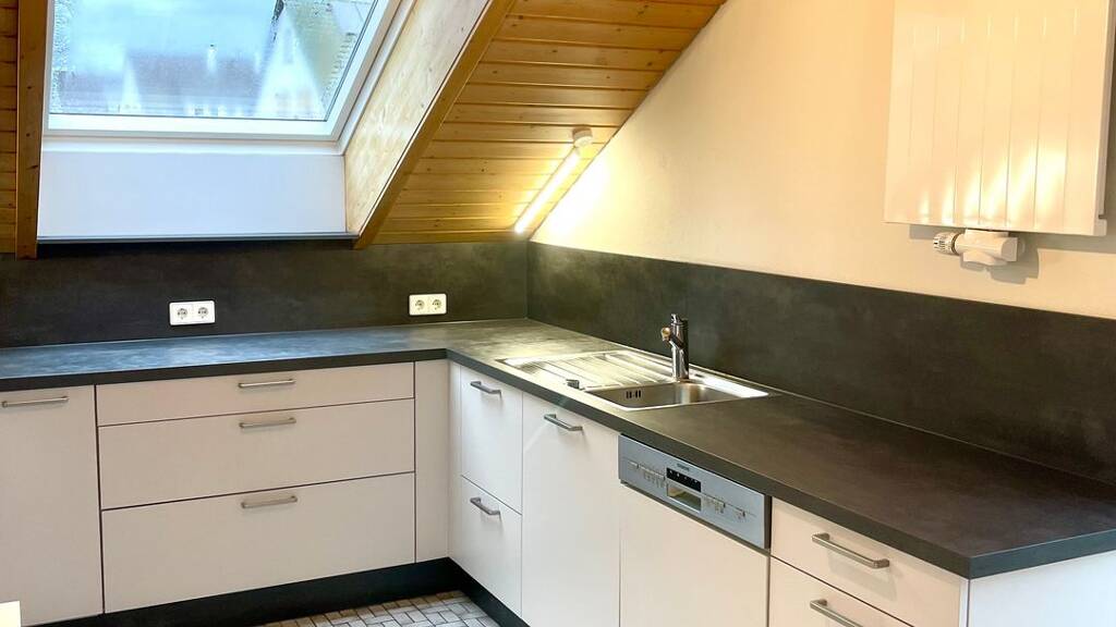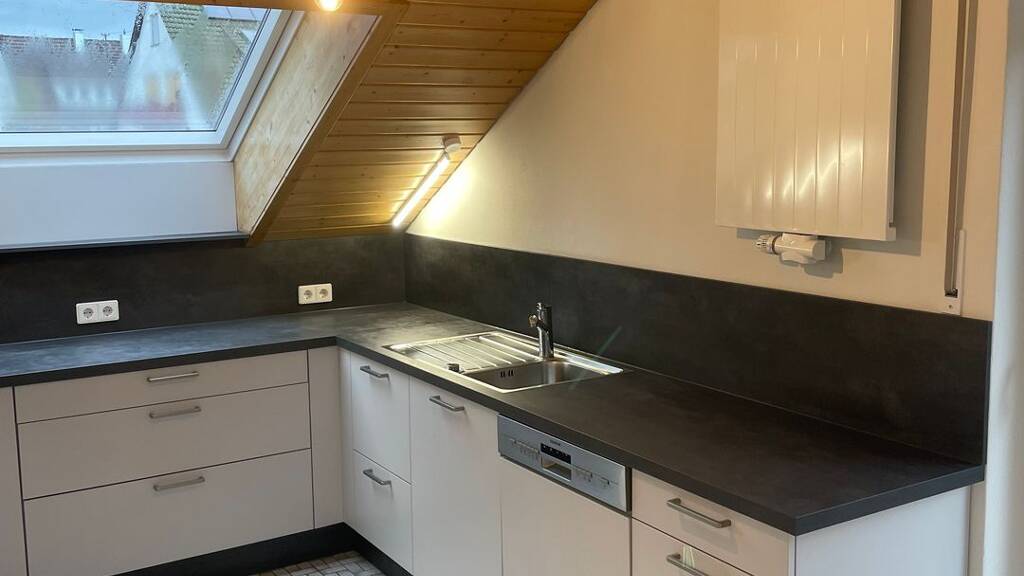 Diese charmante und lichtdurchflutete Dachwohnung befindet sich in idyllischer, ruhiger Lage am Ortsrand von Ammerbuch-Poltringen – im Dachgeschoss eines gepflegten Zweifamilienhauses. Das Haus wurde 1972 erbaut und 1997 umfassend umgebaut. Die Wohnung selbst wurde 2023 modernisiert und präsentiert sich in einem sehr gepflegten, modernen Zustand. Ausstattung & Modernisierungen (2023) • Neue Einbauküche • Neue Balkontüren • Modernes WC • Neue Paneldecke im Wohn-Essbereich • Vinylboden im Flur • Abgeschliffenes & aufgearbeitetes Parkett in Wohn-, Schlaf- und Arbeitszimmer Raumaufteilung & Atmosphäre Die Wohnung überzeugt durch eine helle, freundliche Atmosphäre mit großen Dachfenstern und einem großzügigen Wohn- und Essbereich. Vom Wohnzimmer und von der Küche aus gelangen Sie auf den sonnigen Balkon. Wohn- und Essbereich: großzügig, lichtdurchflutet, mit zwei großen Dachfenstern. Küche ist separat. • Schlafzimmer: Platz für einen großen Kleiderschrank • Weiteres Zimmer: ideal als Arbeits- oder Gästezimmer • Separates WC und Tageslichtbad • Abstellraum direkt neben der Wohnung Böden • Wohn-, Schlaf- und Arbeitszimmer: Echtholzparkett • Flur: Vinyl • Küche, Bad, WC: Fliesen Weitere Details • Separater Wohnungseingang • Zwei Außenstellplätze optional anmietbar • Zwei Radstellplätze ebenso optional nutzbar • Dachfenster mit Rollos • Ruhige Lage am Ortsrand mit sehr guter Verkehrsanbindung nach Tübingen (Bus, Bahnanschluss in Pfäffingen, Fahrradwege)