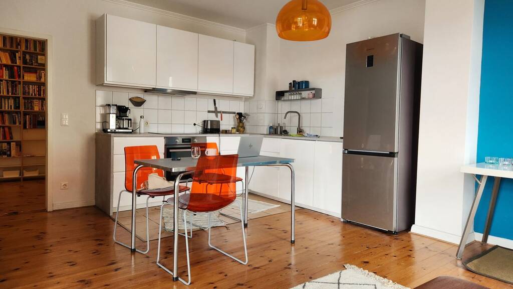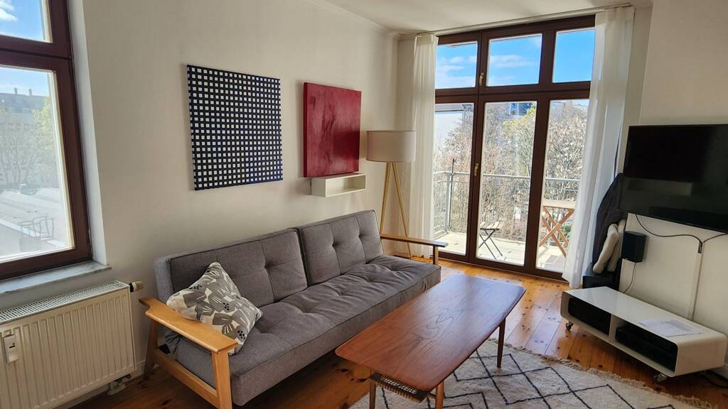 Mittendrin in Berlin, umgeben von zahlreichen Bars, Restaurants, Galerien – und zugleich idyllisch friedlich: Die modern eingerichtete Zwei-Zimmer-Wohnung in einem denkmalgeschützten Altbau ist ein Großstadtwunder mit idyllischem Balkon und Gemeinschaftsgarten. Sie verfügt über eine umfassend ausgestattete neue Wohnküche mit Herd, Ofen, Spülmaschine und der Superkaffeemaschine Moccamaster. Das Doppelbett im Schlafzimmer hat eine gute Matratze, die Schlafcouch im Wohnzimmer bietet Platz für Besuch. Bettzeug und Handtücher werden gestellt. Es gibt keine persönlichen Gegenstände in der Wohnung außer einer Bibliothek voller Bücher, CDs, DVDs, die Mieter gerne nutzen können. Selbstverständlich gibt es WiFi, zudem eine Stereoanlage und einen Smart TV. Ideal für Singles und Paare, nicht Familien- oder WG-tauglich (sorry, auch wenn die Seite hier so heißt). Miete ist inklusive allem, also Nebenkosten, Heizung, Strom, GEZ, Wifi. Mindestmietzeit: zehn Monate. Anmeldung möglich. ------------------ This fully furnished city apartment is located amongst some of Berlin's best restaurants, bars and food stores and just minutes away from all sorts of public transport (tube, train, tram) and close to many galleries and museums. The flat is to be found in Bergstraße, Berlin-Mitte, in a quiet courtyard with a private park. It is located on the third floor, reachable with an elevator and has an idyllic balcony. It has one bedroom with a double bed and a kitchen-diner with a daybed. It's very well heatable, unfortunately with Gaz though. There is a washing machine. The flat is equipped with Wifi, a stereo and a smart TV. Bedding and towels are available as well as a hair dryer and an iron. It does not contain any personal items but a large library full of interesting books, CDs and DVDs. Minimum time to rent this flat is six months. Ideal for couples and single persons. The flat is free from 10 April. Rent is 1590 Euros per month all inclusive (heating, power, cable, Wifi). Minium time to rent is 10 months. Best suited for couples and single persons, not made for families and flat mates unfortunately. Anmeldung possible.