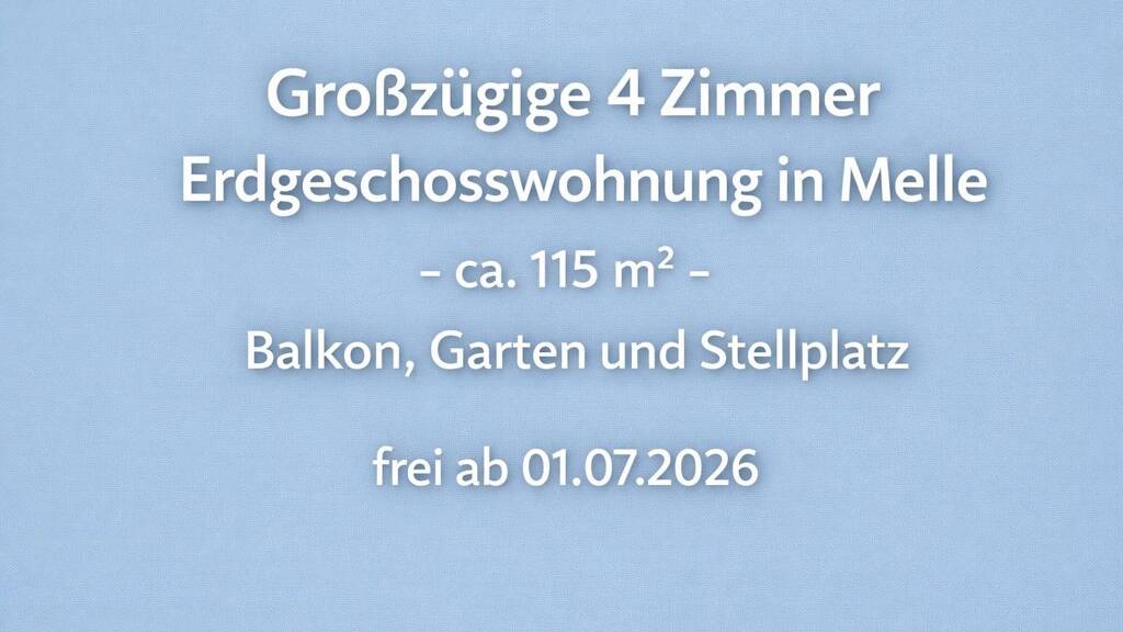 Diese schöne und großzügige 4 Zimmer Wohnung ist ab dem 01. Juli 2026 bezugsfrei und liegt in ruhiger Lage direkt am Grönenberger Park in der Innenstadt von Melle. Einkaufsmöglichkeiten, Schulen und weitere Einrichtungen des täglichen Bedarfs befinden sich in unmittelbarer Nähe. Das Haus umfasst nur vier Parteien und liegt in einer Sackgasse. Die ca. 115 m² Wohnung befindet sich im Erdgeschoss und überzeugt durch einen sehr angenehmen Grundriss mit hellen und freundlichen Räumen. Sie eignet sich ideal für Paare oder kleine Familien. Das Wohnzimmer bietet Zugang zum Balkon und von dort über wenige Treppen direkten Zugang zum Gemeinschaftsgarten. Die moderne Einbauküche ist etwa zweieinhalb Jahre alt und kann gerne von der aktuellen Mieterin gegen eine Abstandszahlung von 2.500€ Verhandlungsbasis übernommen werden. Eine Übernahme durch die neuen Mieter*innen wäre sehr willkommen. Der Laminatboden wurde vor etwa 6 Jahren erneuert, die Wände wurden vor rund zweieinhalb Jahren gestrichen. Das Badezimmer verfügt über eine ebenerdige Dusche, zwei Waschbecken und eine praktische Schiebetür. Eines der Waschbecken ist höhenverstellbar. Zusätzlich steht ein separates WC zur Verfügung. Die drei Schlafzimmer sind ähnlich groß und können flexibel als Schlafräume, Kinderzimmer oder Büro genutzt werden. Zusätzlichen Stauraum bietet der eigene abschließbare Kellerraum. Zur Wohnung gehört außerdem ein PKW-Stellplatz direkt am Haus. Kaltmiete: 845 Euro / Monat Nebenkosten: 80 Euro / Monat zzgl. Gas-, Wasser- und Stromkosten Die Wohnung ist ausgestattet mit einer eigenen Gas-Thermenheizung (6 Jahre alt). Gas, Wasser und Strom müssen direkt mit einem Versorger abgerechnet werden. Die Nebenkosten verstehen sich ohne Heiz-, Wasser- und Stromkosten. Ein Kabelanschluss ist vorhanden. Bei Interesse freuen wir uns über eine kurze Vorstellung Ihrer Person bzw. Ihres Haushalts. Angaben zu Beruf, Anzahl der einziehenden Personen sowie zum gewünschten Einzugstermin helfen uns sehr bei der Auswahl.