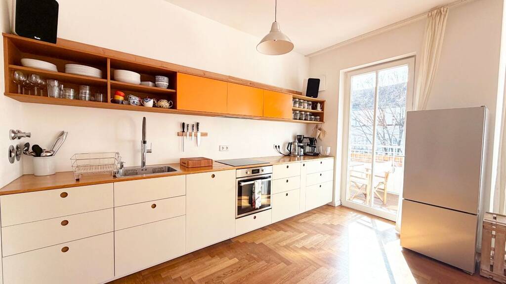 Die Wohnung verfügt über eine moderne Einbauküche, ein Induktionskochfeld, einen Geschirrspüler, einen Kühlschrank mit Gefrierfach sowie einer Waschmaschine. Schlafzimmer sind komplett mit bequemen Matratzen ausgestattet.