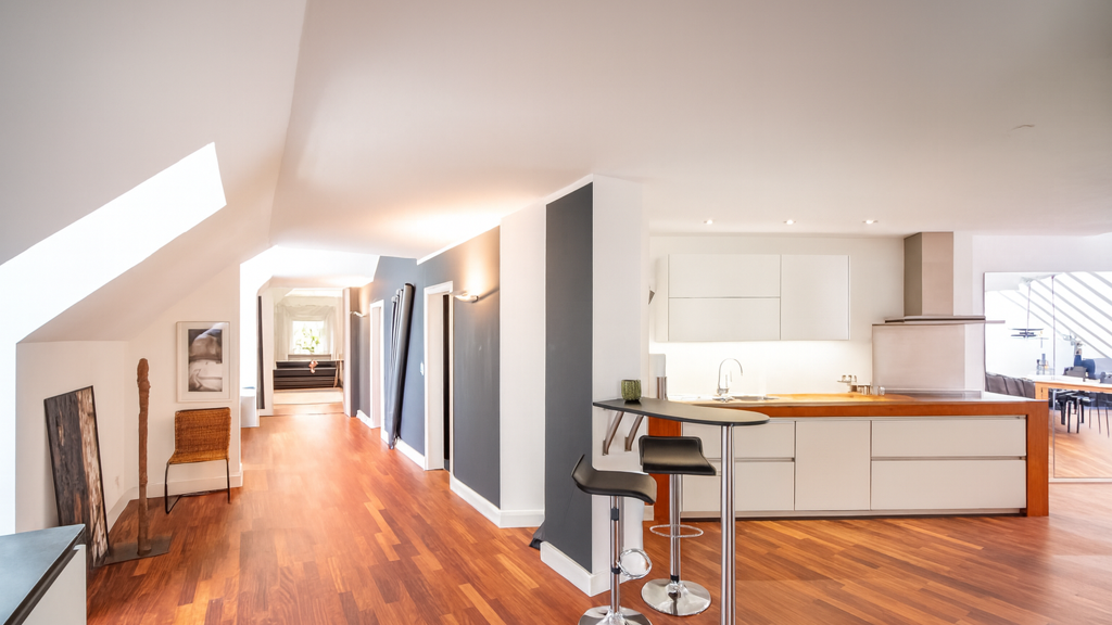 Beim Betreten der Wohnung gelangen Sie direkt in ein großzügiges, lichtdurchflutetes Esszimmer, das dank des privaten Lifts bequem erreichbar ist. Hier befindet sich auch die offene Einbauküche, die mit modernen Geräten und viel Stauraum ausgestattet ist - ein Paradies für jeden Hobbykoch und Gastgeber.