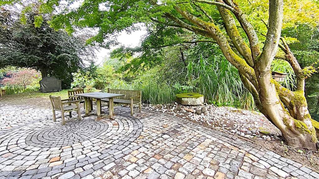 Zum Haus gehört ein großes weitläufiges Gartengrundstück, das sowohl vom Wohnzimmer der größeren Eigentümerwohnung, als auch von der Küche aus betreten werden kann. Diese Wohnung wurde umfassend modernisiert und den individuellen Bedürfnissen angepasst. Besonders die geräumige Wohnküche wurde liebevoll umgestaltet und mit hochwertigen Elektrogeräten ausgestattet. Ebenfalls im Erdgeschoss liegt das vom Flur aus begehbare gemütliche Wohnzimmer mit dem offenen Kamin, die große Wohnküche, das Gäste-WC, sowie ein weiterer Wohnraum. Eine Treppe führt ins Obergeschoß zum Bad und zum Schlafzimmer mit der von dort aus zugänglichen Terrasse. Das großzügig geschnittene Grundstück bietet Platz zum Parken vor dem Haus. Der große Abstellraum ist von außen aus zu betreten. Beide Wohnungen haben einen separaten Außenzugang, wobei sich die Räume jeweils auf 2 Etagen verteilen. Die im Obergeschoß liegende Terrasse ist von beiden Wohnungen aus zugänglich. Zum Haus gehört ein von der Stadt Essen geduldetes angebautes Pflanzenhaus und ein von der Stadt Essen geduldetes freistehendes Holz-Blockbohlenhaus.