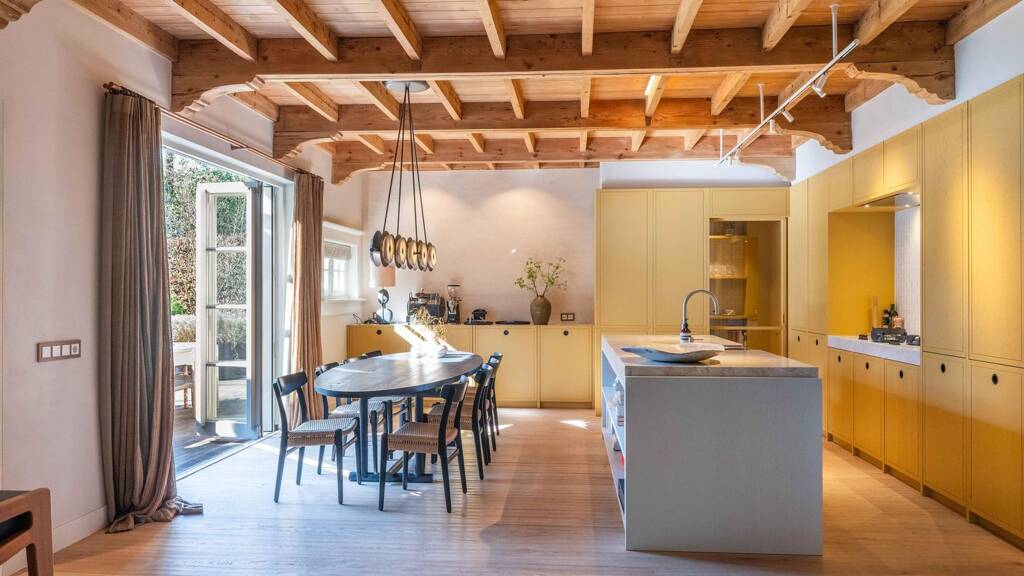 let's go inside: the entrance leads to a spacious hall with a cloakroom, a modern toilet and access to the basement. from here, you walk through to the spacious kitchen-diner, the central hub of the home. this features a cooking island, natural stone worktops and high-quality built-in appliances. thanks to the french doors, there is a direct connection to the outdoors.
