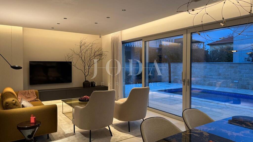 Zum Verkauf steht eine moderne Wohnung mit Pool im Untergeschoss einer Stadtvilla in einem Neubau im Zentrum von Krk.