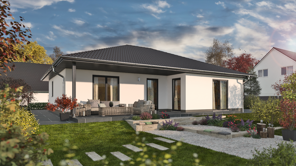 Wohnglück ohne Hindernisse - Dieser Winkelbungalow fällt nicht nur durch sein charmantes Design auf. Die markante Winkelform ermöglicht einen überdachten Terrassenbereich zum Wohlfühlen. Die besondere Raumanordnung des Winkelbungalows 108 mit Gäste-WC sowie die vielen kleinen Details machen das Wohnen für Sie zum Genuss.