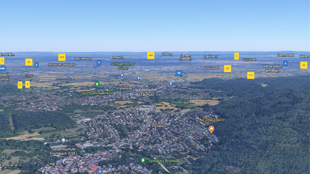 Kelkheim grenzt im Norden an die Gemeinde Glashütten und die Stadt Königstein im Taunus (beide Hochtaunuskreis), im Osten an die Stadt Bad Soden und die Gemeinde Liederbach, im Süden an die kreisfreie Stadt Frankfurt am Main und die Stadt Hofheim sowie im Westen an die Stadt Eppstein. Die TOP-Lage des Neubauprojektes bietet eine gute, gewachsene Infrastruktur. Öffentliche Verkehrsmittel sind fußläufig zu erreichen. Über die Bundesstraßen gelangen Sie schnell mit dem Pkw auf die A66, die sie mit Frankfurt und Wiesbaden verbindet sowie weitere Anschlussmöglichkeiten auf die A5 und A3 bietet. Der Frankfurter Flughafen ist auch in wenigen Minuten mit dem PKW erreichbar.