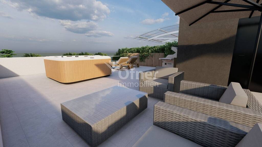 Die Raumaufteilung umfasst einen Flur, ein Schlafzimmer, ein weiteres Schlafzimmer mit eigenem Bad, ein zusätzliches Badezimmer sowie eine Küche mit Essbereich, die mit dem Wohnzimmer verbunden ist. Vom Wohnzimmer aus gelangt man auf die Loggia, während die Schlafzimmer Zugang zu einer überdachten Terrasse haben. Über das Treppenhaus erreicht man die große Dachterrasse - ideal zum Entspannen und geselligen Beisammensein. Zur Wohnung gehört außerdem ein Stellplatz.