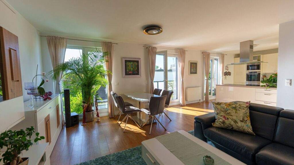 Mit einer Wohnfläche von ca. 95 m² bietet diese Wohnung ausreichend Platz für Paare und kleine Familien. Der Wohnbereich mit offener Küche erstreckt sich über beeindruckende ca. 42 m² und bildet das Herzstück der Wohnung. Die Küche ist mit modernen Geräten von Miele ausgestattet und lässt keine Wünsche offen - ideal für passionierte Köche. Der angrenzende Süd-West-Balkon mit einer Fläche von 13 m² lädt zum Entspannen ein. Für zusätzlichen Komfort sorgen elektrische Rollläden und Markisen.