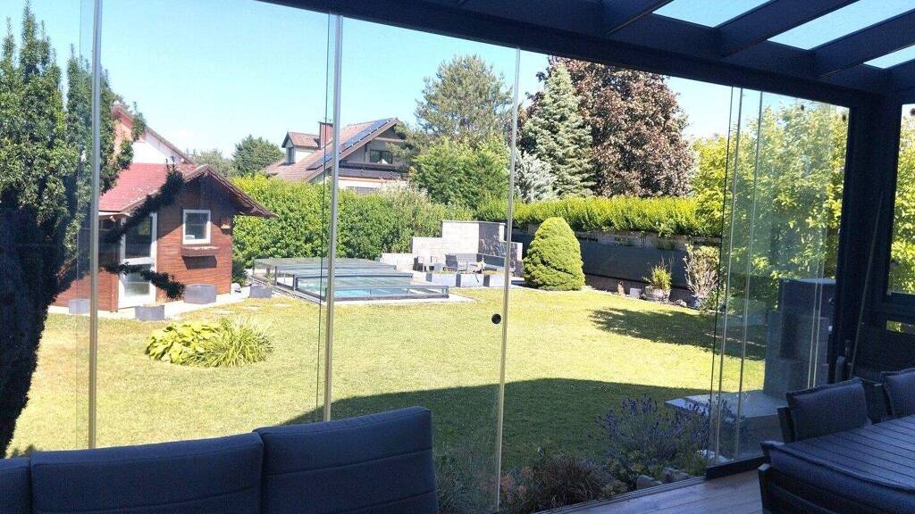 Dem Wohnzimmer vorgelagert liegt der verglaste Wintergarten, von dem man in den äußerst gepflegten Garten gelangt. Hier wurde nicht nur ein überdachtes Pool (6 x 3 mtr.) mit angrenzender gemütlicher Sitzecke errichtet sondern hier findet sich auch ein Gartenhaus mit viel Stauraum für Gartenmöbel und Geräte.